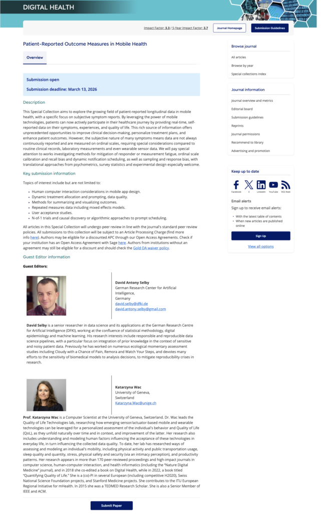 Mar 2026: Special Issue of the SAGE Digital Health Journal: “Patient-Reported Outcome Measures in Mobile Health”